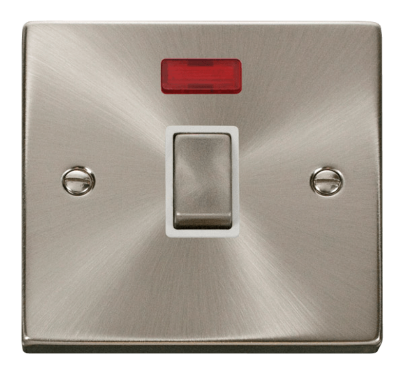 Sold by Scolmore Click, this is the VPSC723WH Ingot Switch+Neon Double Pole 20A White Insert Victorian. This is a Satin Chrome switch featuring a contemporary, square edge profile designed to look incredible against any style of interior décor. The Satin Chrome range is manufactured from stainless steel. All Click Deco switches are modular in design, and therefore can be customised with alternate switches if needed.