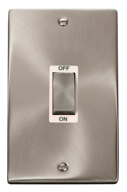 Sold by Scolmore Click, this is the VPSC502WH Switch 2 Gang Double Pole 45A White Insert Victorian. This is a Satin Chrome switch featuring a contemporary, square edge profile designed to look incredible against any style of interior décor. The Satin Chrome range is manufactured from stainless steel. All Click Deco switches are modular in design, and therefore can be customised with alternate switches if needed.
